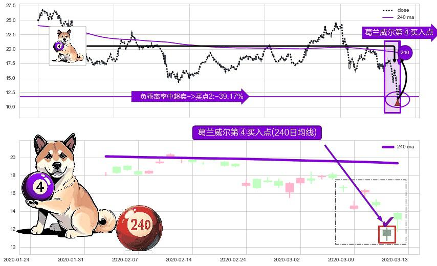 形态多维评估: ⚀ 2020-03-12-日显现 葛兰威尔均线 240日均线 第④买入点 下降趋势均值回复的短线反弹信号,后市看涨,买进信号