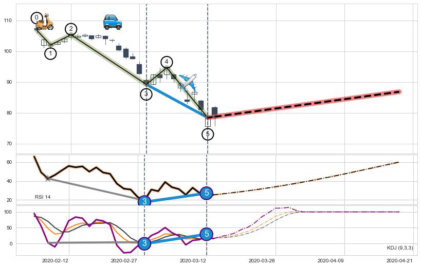➢ 第三,五驱动浪端点:【KDJ】走势出现【常规背离 & 反转信号】背离程度87.24%,背离夹角角度68.2˚,背离程度较大