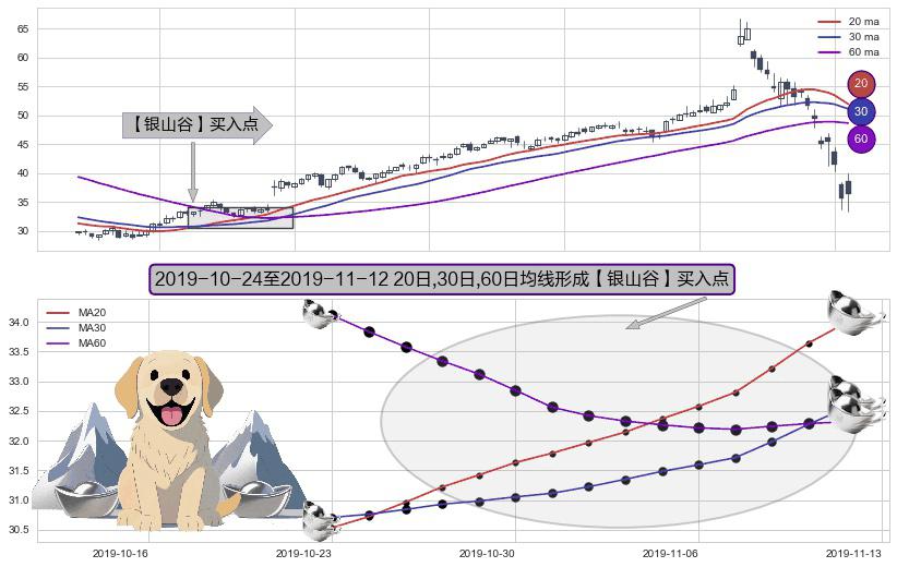 形态多维评估: ⚀ 2019-10-25-日至2019-11-12-日显现 20日-30日-60日均线 【银山谷】买入点 看多信号,后市看涨,买入