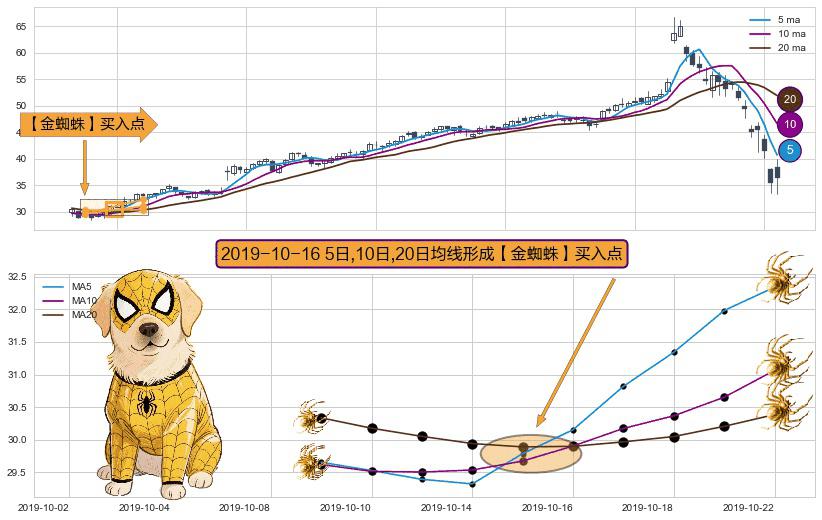 形态多维评估: ⚀ 2019-10-16日显现 5日-10日-20日均线 【金蜘蛛】买入点 看多信号,后市看涨,买入