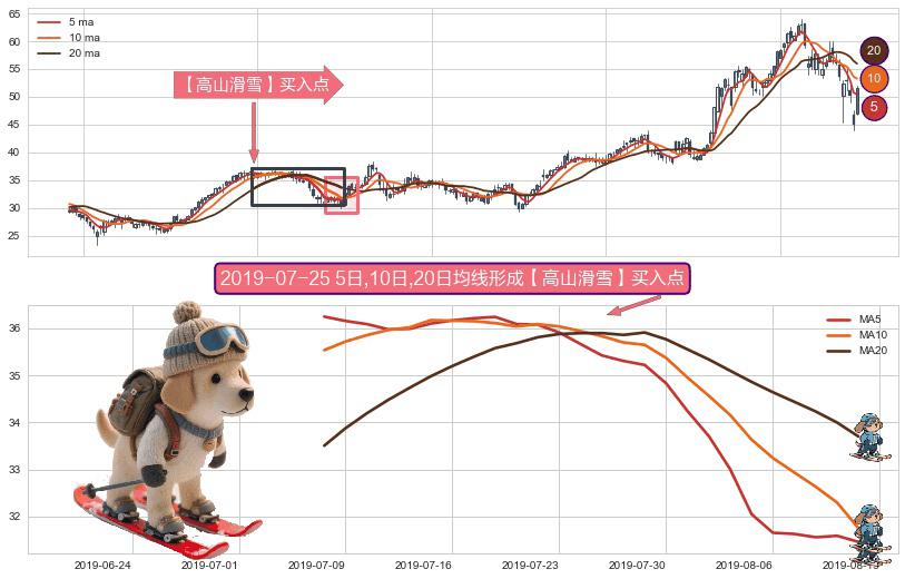 ⚀ 2019-07-08日-2019-08-12日显现 5日-10日-20日均线 【高山滑雪】买入点 看多信号,后市看涨,买入