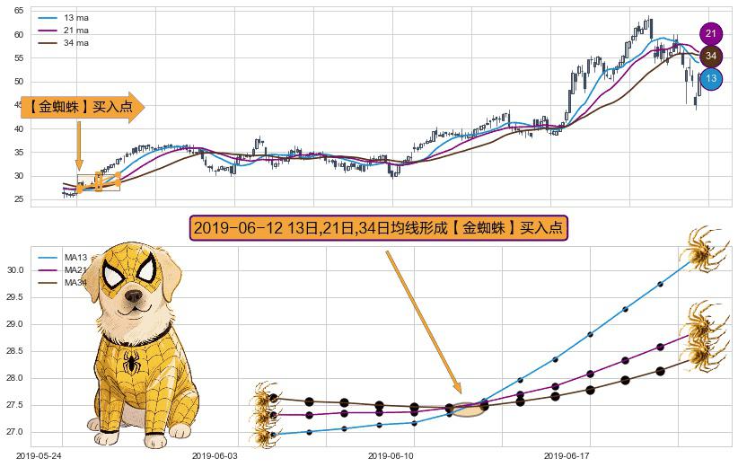 ⚀ 2019-06-12日显现 13日-21日-34日均线 【金蜘蛛】买入点 看多信号,后市看涨,买入