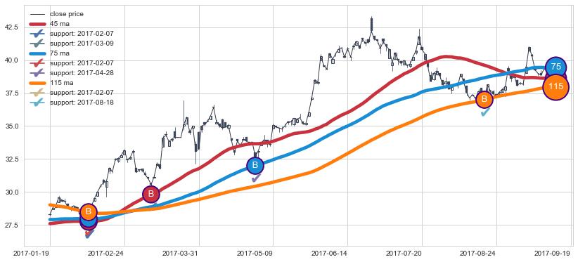 上涨趋势2017-01-19-2017-09-19,均线115, 75, 45确认关键支撑4处