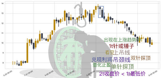吊颈线(上吊线)出现在上涨趋势行情中,其形态特征类似定海神针或锤子线在高位上涨趋势中的复现(单针探顶),但其特征k线需要两根,1针或锤子2阴线或阳跌,且第二根的收盘价格需要低于第一根的最低价格,第一根可以为阳或阴,但阴的可信度更高,如果第二根同样形成一根针或锤子,其形态将进化为类似高位上涨趋势中‘双针探顶’的形态。
