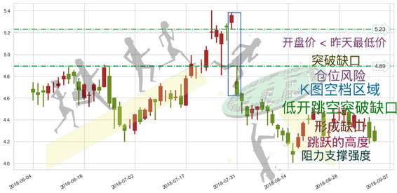 当股价或股指当天的开盘价低于昨天的最低价且之后都以低于该点的位置交易时,一个向下的缺口形成,缺口的有效性,一般来说3-7个交易日不回补缺口,缺口就有效,市场将继续此前的趋势,所以下跌缺口是一种空头形态,多空双方的其中一方以较大优势压倒对方造成的盘面状况,常常发生在开盘交易、信息突然刺激、力量突然失衡时,原因就是多空双方的情绪发生着较大变化,缺口是指价格快速变动时,在某一价区没有任何交易,显示在价格图表上是一个“真空”区域,这个区域就是缺口,可称为“跳空”。根据缺口所处的位置不同,可以分为普通缺口,突破缺口,中继缺口,竭尽缺口。