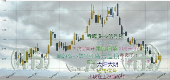 乌云盖顶形态出现在上涨趋势行情中,乌云盖顶形态特征由两根K线构成,第一天大阳(如创短期新高信号更强),第二天大阴,核心是第二天需要跳空高开,且最少要比第一天的最高要高,第二日高开后持续走低,结果在收盘时反而收阴下跌,把开盘的跳空全部吃掉外还吞噬了第一根阳线的大部分,吞噬的越多信号越强,但如果有比较强的下影线会削尖信号强度。